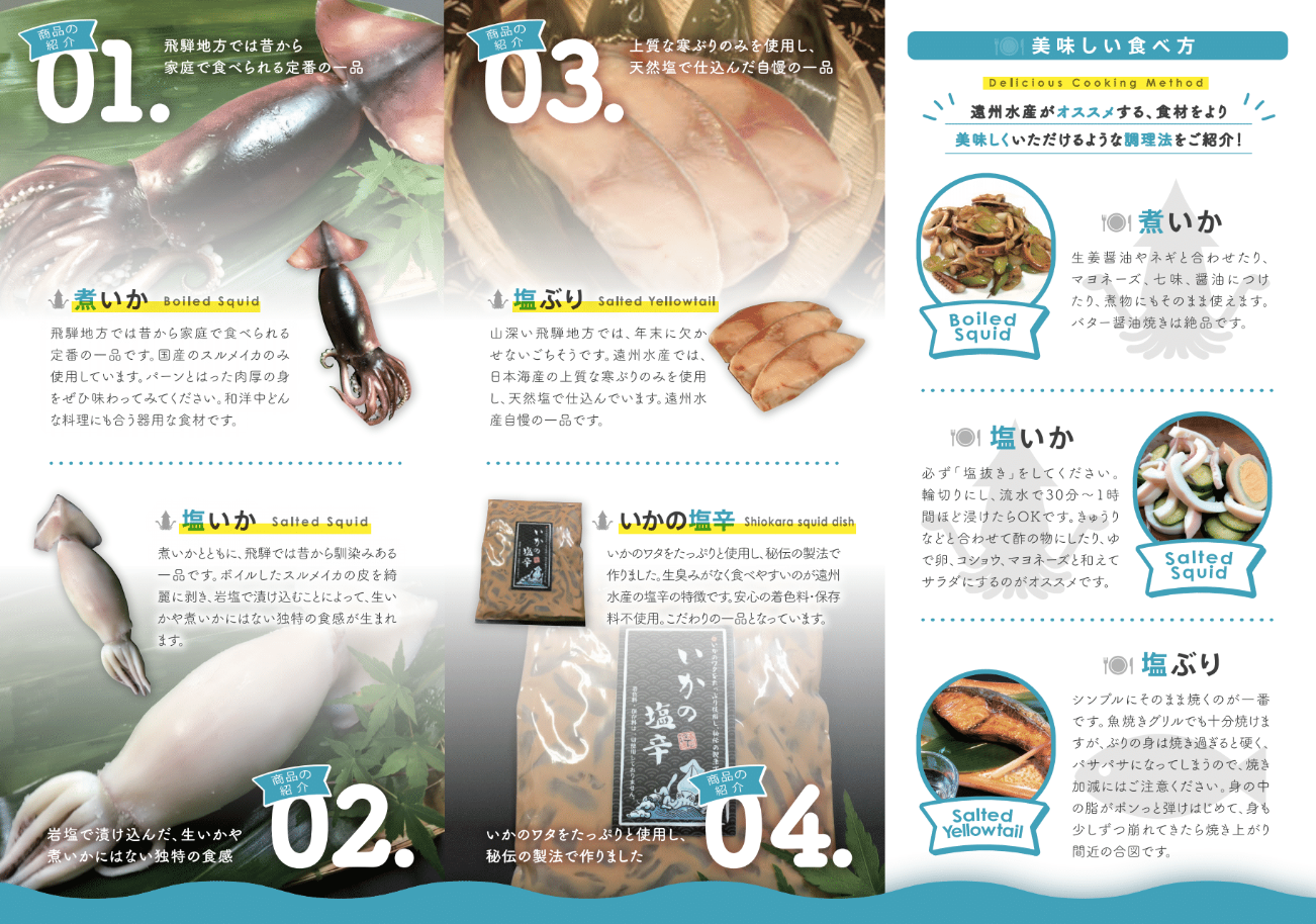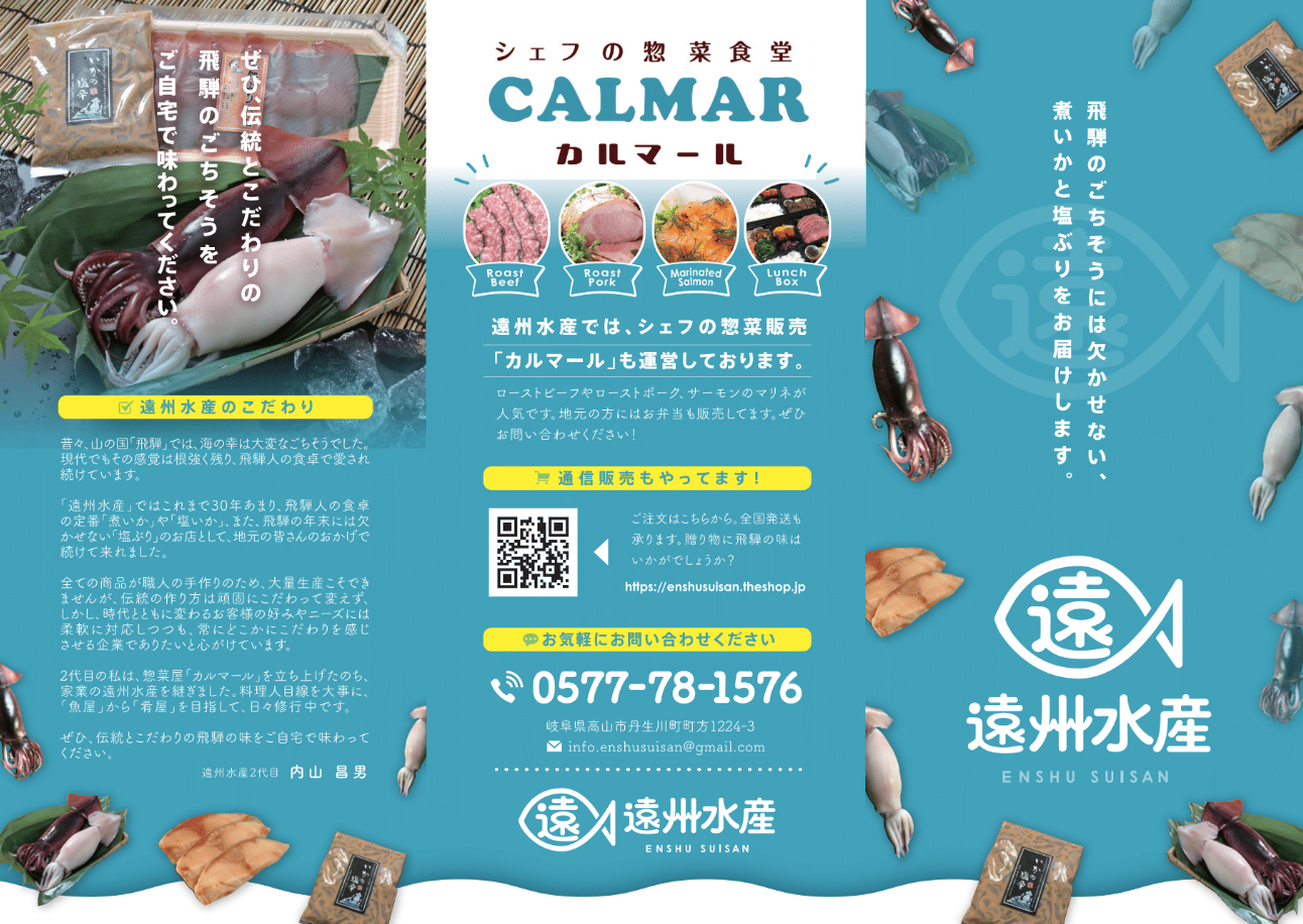 高山市の水産加工会社「遠州水産」様よりご依頼いただき、 ロゴマーク、化粧箱、パンフレット、ネットショップと トータルブランディングを制作いたしました。 遠州水産 / カルマール https://enshusuisan.theshop.jp/