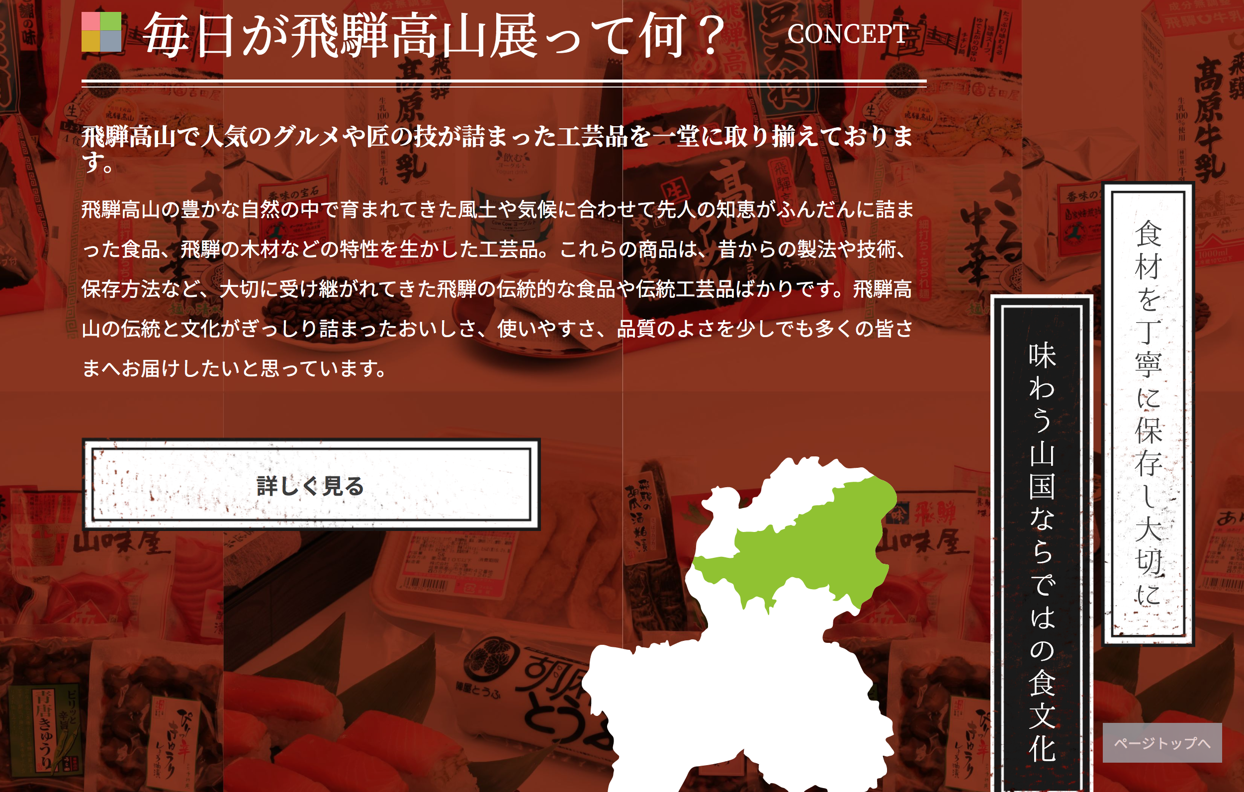 高山市産業振興協会 様のご依頼で、オンラインショップ「毎日が飛騨高山展」を制作いたしました! 飛騨牛や高山ラーメン、駄菓子などの飛騨高山の地元グルメと、一位一刀彫や飛騨春慶塗といった伝統工芸品などを計51社の約400点販売しております。 https://www.hidatakayama-online.jp/